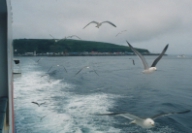 ![]() 天売島には多くの海鳥が棲む。白い点はみな海鳥たち。後方に北海道本土も。2003年7月撮影。